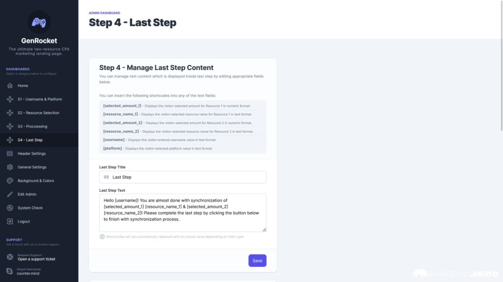 With the use of 6 supported shortcodes you can easily insert dynamic values, selected by the visitor, inside the proccessing or last step text strings. Supported shortcodes include [username], [platform], [resource_name_1], [resource_name_2], [selected_amount_1] and [selected_amount_2].